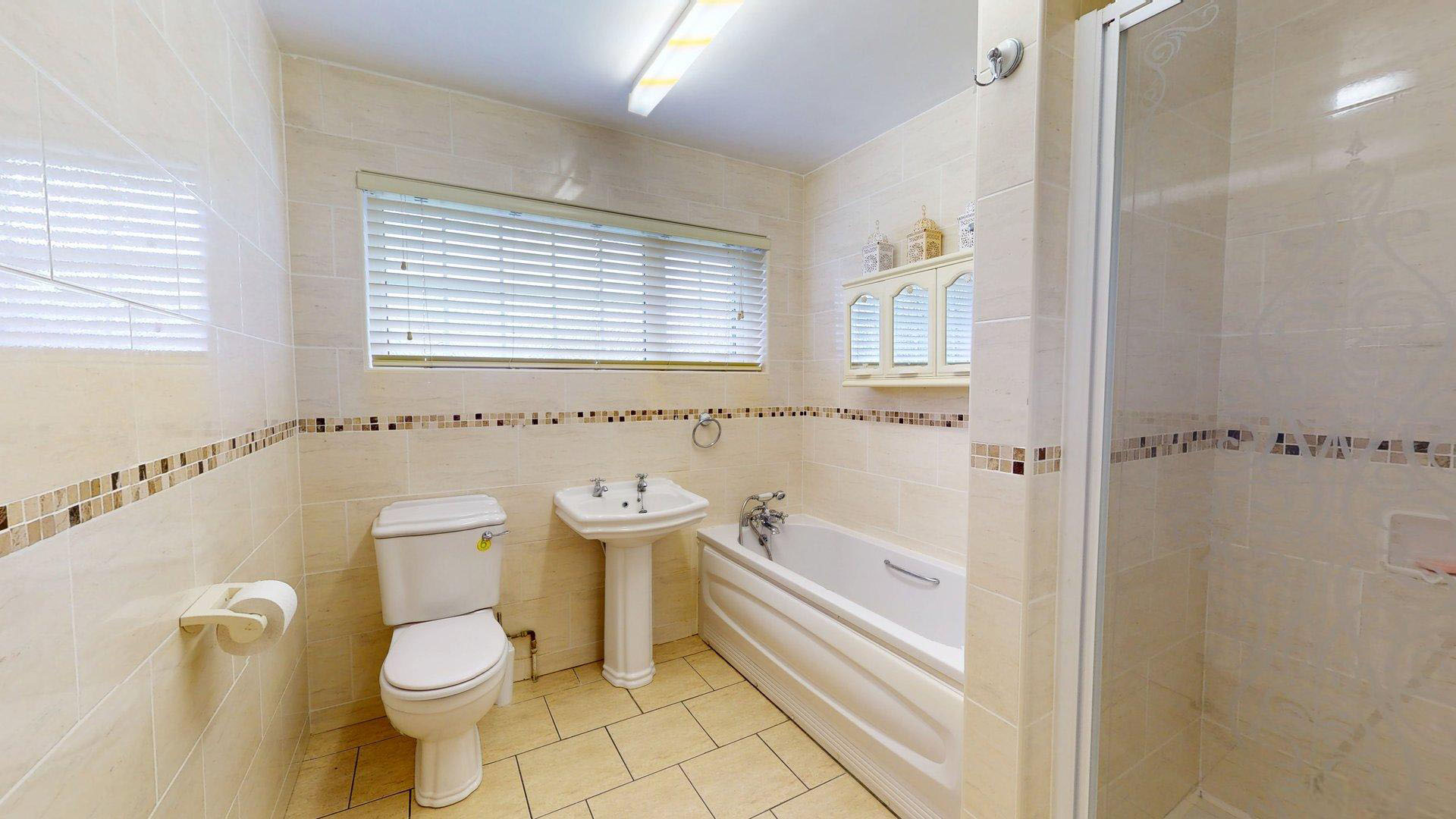 8'2 x 7'4 White 4 piece suite comprising bath with telephone taps and shower attachment. Pedestal wash hand basin. Low flush w.c. Separate walk-in shower unit with MIRA Electric shower. Feature tiling to walls and floor.