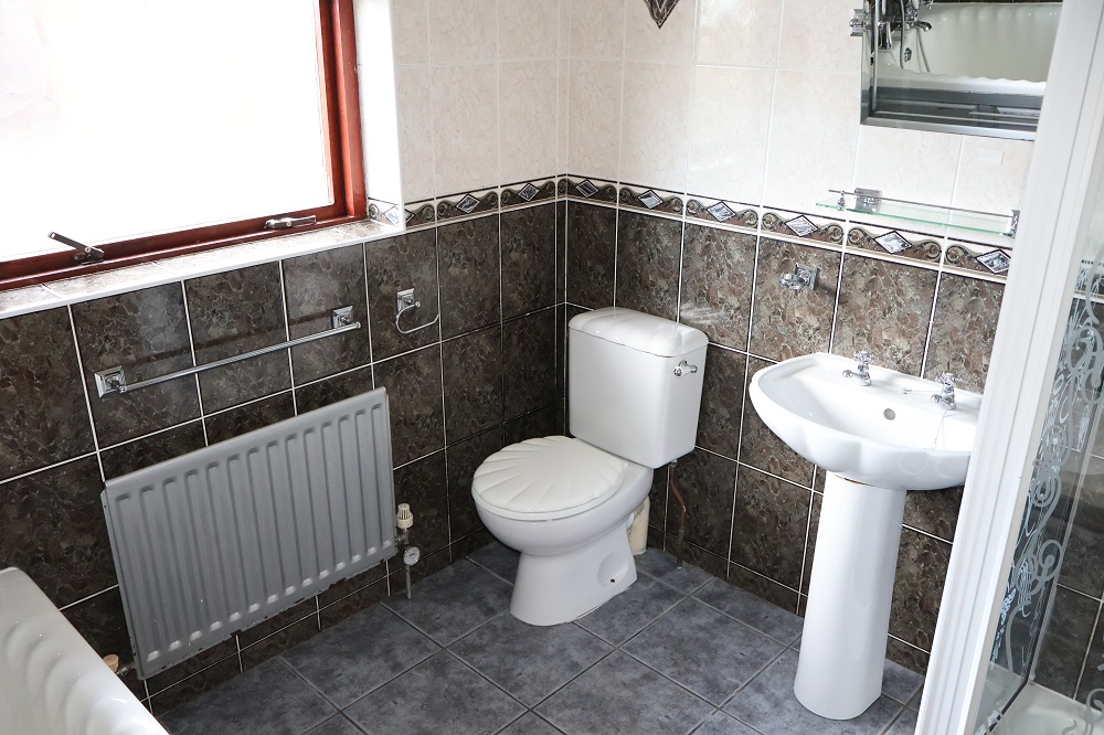 7'6 x 7'4 White 4 piece suite comprising bath with telephone taps and shower attachment. Pedestal wash hand basin. Low flush w.c. Separate walk-in shower unit with REDRING Electric shower. Tiled floor and walls. Wall mirror.