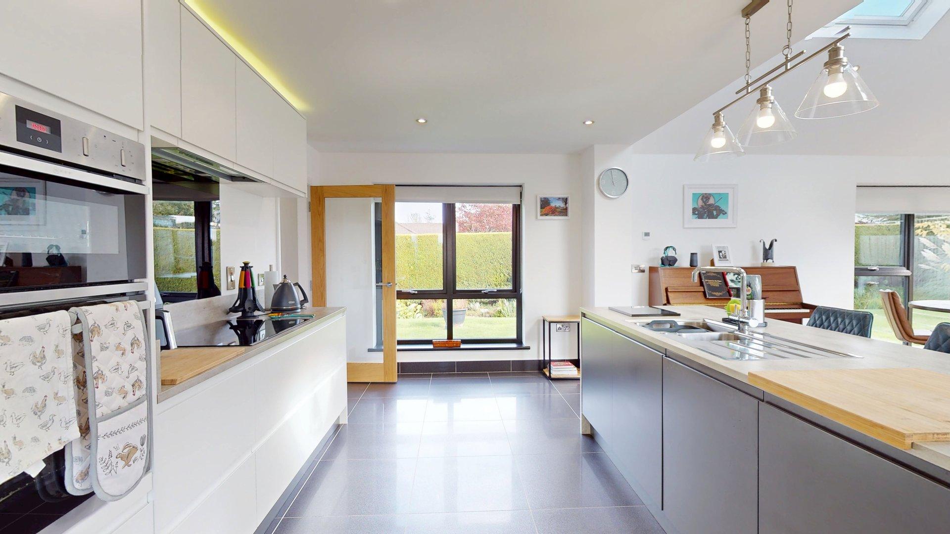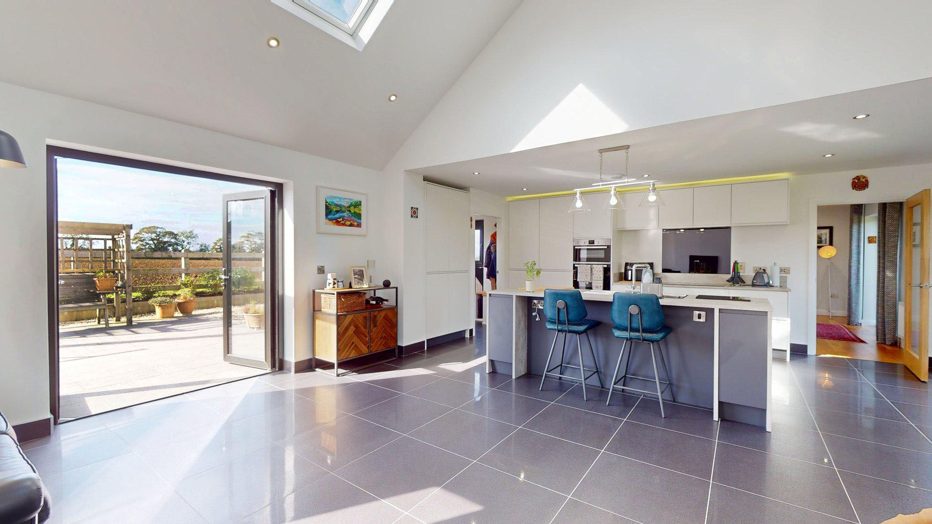 Integral dishwasher and fridge/freezer. NEFF double eyelevel oven and NORDMENDE 4 ring Induction hob with feature splashback. Oak glass panelled door leading into hallway. Feature high vaulted ceiling. Hole-in-wall fireplace housing Cast Iron, cassette multifuel fire. Landscape, Picture corner window. uPVC French doors leading out unto paved patio area.