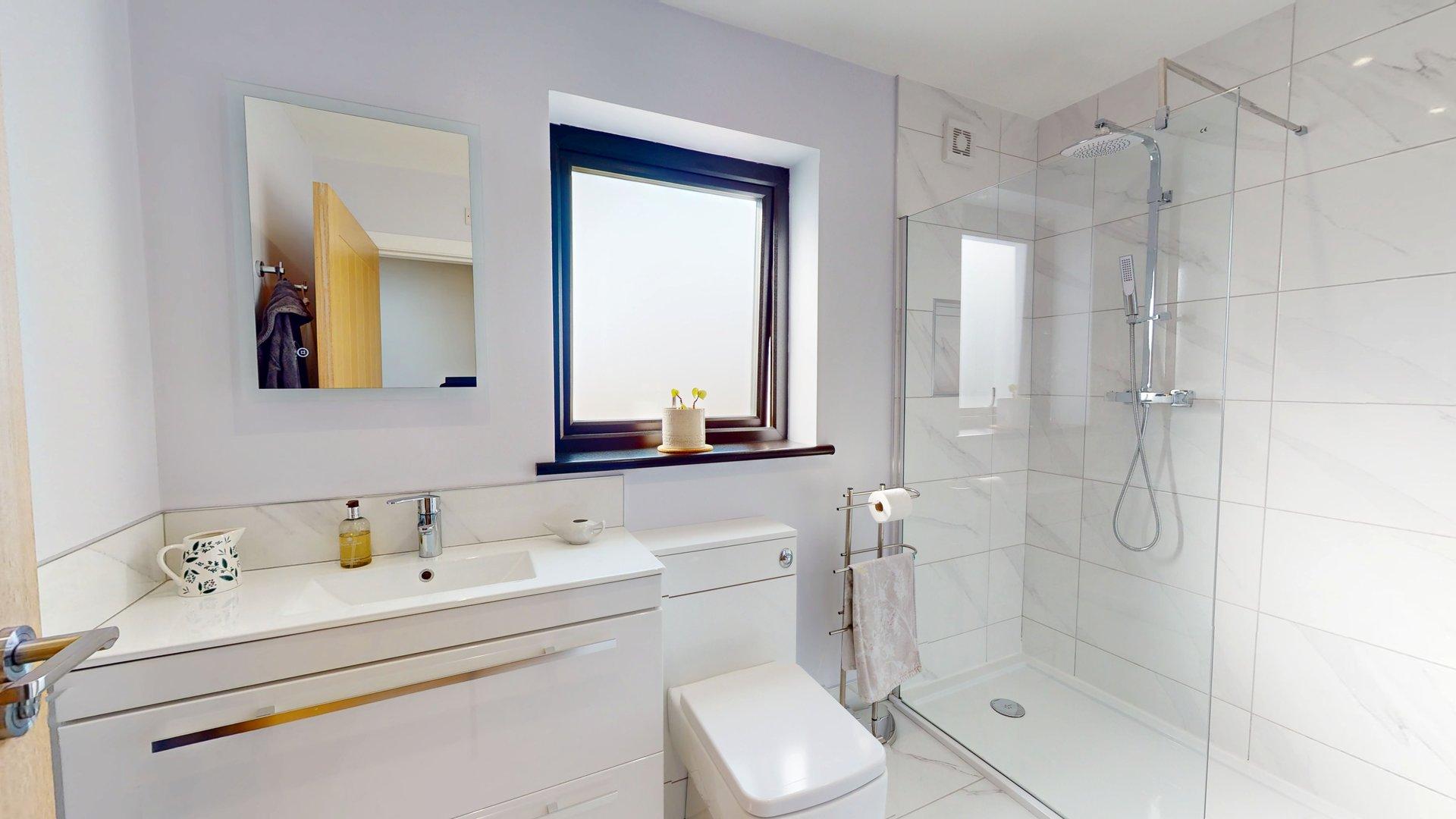 9'6 x 6'6 White modern, 3 piece suite comprising walk-in shower unit with drying area and overhead rain shower. Vanity unit with wash hand basin and matching wall cabinets. Low flush w.c. Feature tiling to walls and floor. Recessed lights to ceiling. Chrome heated towel rail. Velux double glazed window.