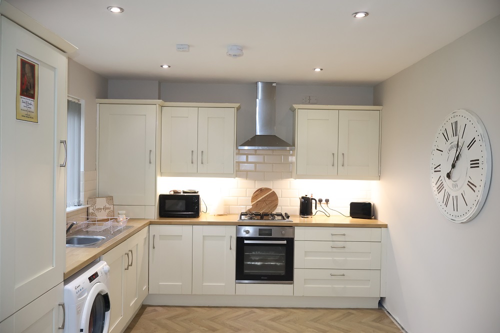 18'4 x 9'8 Excellent range of Contemporary Shaker style units with matching worktops. Stainless steel sink unit and single drainer with chrome mixer taps. Part tiled walls. Vinyl wood effect floor covering. Recessed lights to ceiling. Plumbed for washing machine. Ariston combi boiler. Integrated fridge/freezer. CANDY stainless steel underoven and 4 ring gas hob with canopy housing concealed fan.