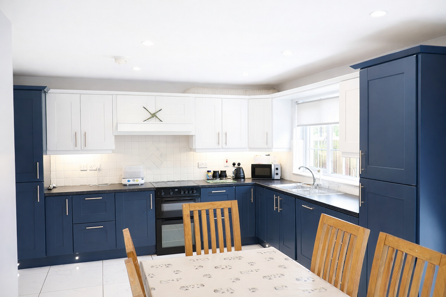19'2 x 10'6 Excellent range of two-tone Shaker style units matching worktops. Stainless steel one and a quarter bowl sink unit and drainer with chrome mixer taps. Part tiled walls. Porcelain tiled floor. Recessed lights to ceiling. Open shelving and window pelmet. BOSCH integral dishwasher. Integral fridge/freezer. BEKO cooker with canopy housing concealed extractor fan. uPVC French Doors.
