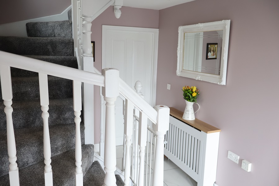 13'8 x 7'10 uPVC front door with double centre light. Porcelain tiled floor. Contemporary radiator covers. Ornate half tiled staircase with understairs Cloakroom/Storage Cupboard.