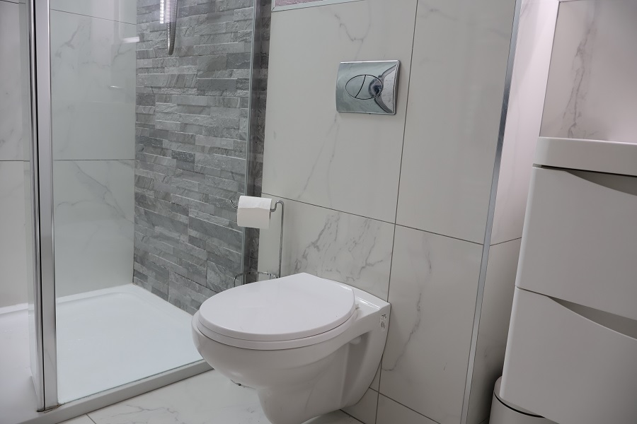 8'4 x 4'6 White 'Deluxe' 3 Piece suite comprising large walk-in shower unit with MIRA SPORT electric shower. High gloss Vanity unit with wash hand basin. Low flush w.c. Feature tiling to walls and floor. Chrome heated towel rail. LED wall mirror.
