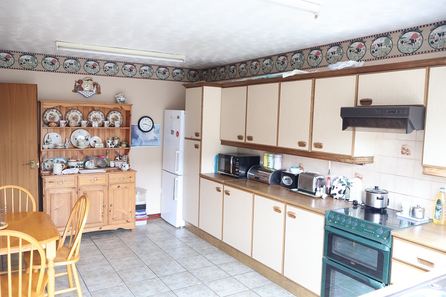 16'6 x 10'4 Good range of built in units with matching worktops. Stainless steel one and a quarter bowl sink unit and drainer with chrome mixer taps. Part tiled walls. Tiled floor. Plumbed for washing machine. CREDA free-standing cooker and ZANUSSI extractor fan. uPVC rear door with double glazed centre light.