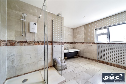 12'0 x 11'2 Deluxe white five piece suite comprising feature free standing bath with telephone taps and shower attachment. Oak vanity unit with marble worktop housing twin wash hand basin with wall mirrors. Low flush w.c. Large walk in shower unit with drying area and Mira Sport electric shower. Good quality tiling to walls and floor. Recessed lights to ceiling. Feature radiator.