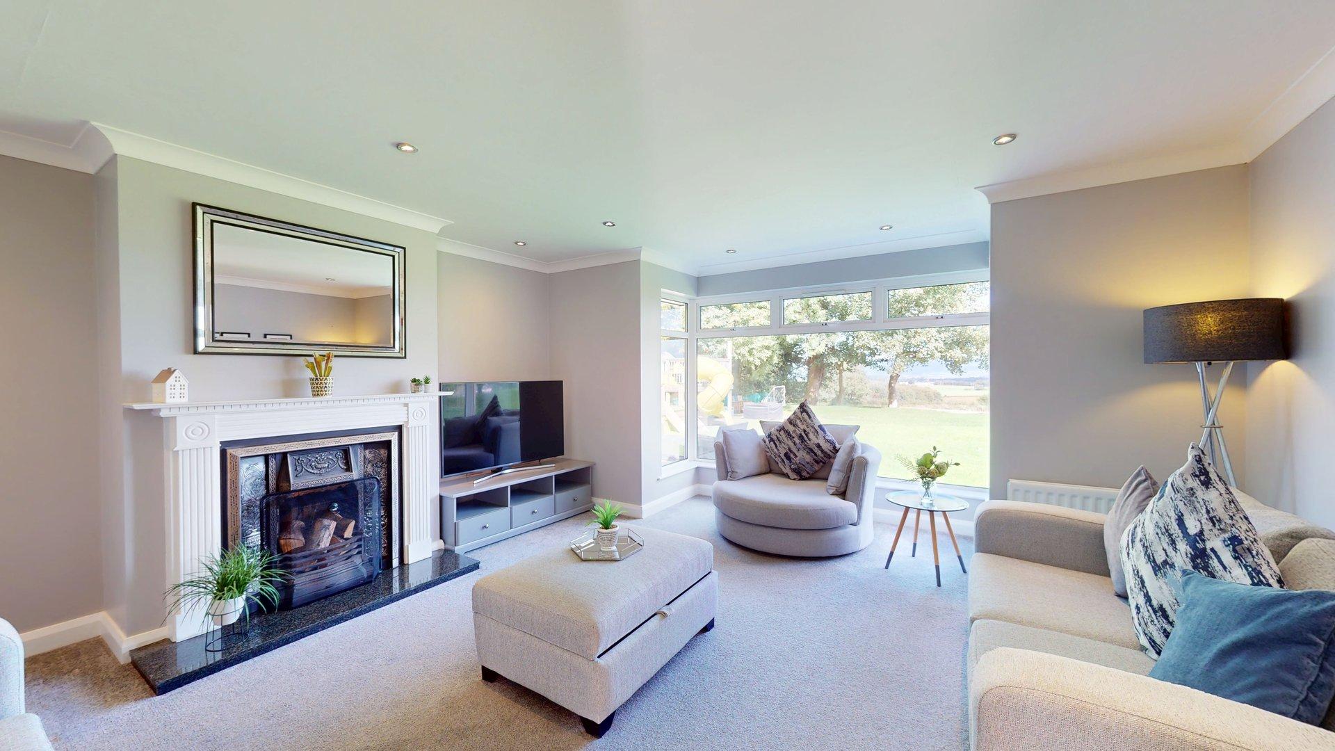 15'6 x 14'6 Feature cast iron fireplace with open fire, granite hearth and contemporary surround. Large bay window enjoying fantastic views out over the Roe Valley. Ceiling cornicing. Recessed lights to ceiling.