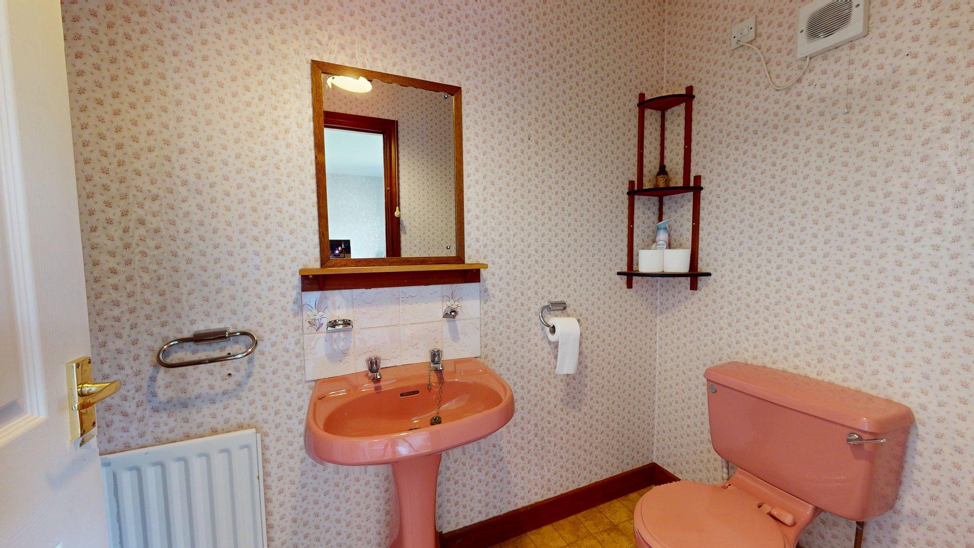 7'6 x 4'2 White 2 Piece suite comprising low flush w.c. and Pedestal wash hand basin. Half tiled walls. Tiled floor.