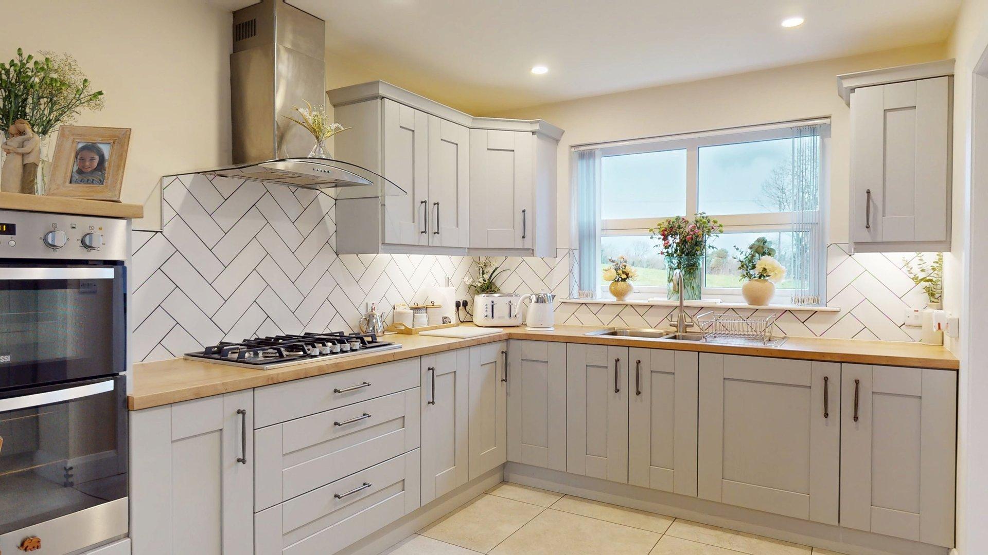 6'2 x 5'8 Contemporary Shaker Style base units with matching worktops and splashback. Stainless steel sink unit unit and single drainer with chrome mixer taps. Plumbed for washing machine. Ducted for tumble dryer. Vinyl tile effect floor covering. uPVC rear door with double glazed centre light.