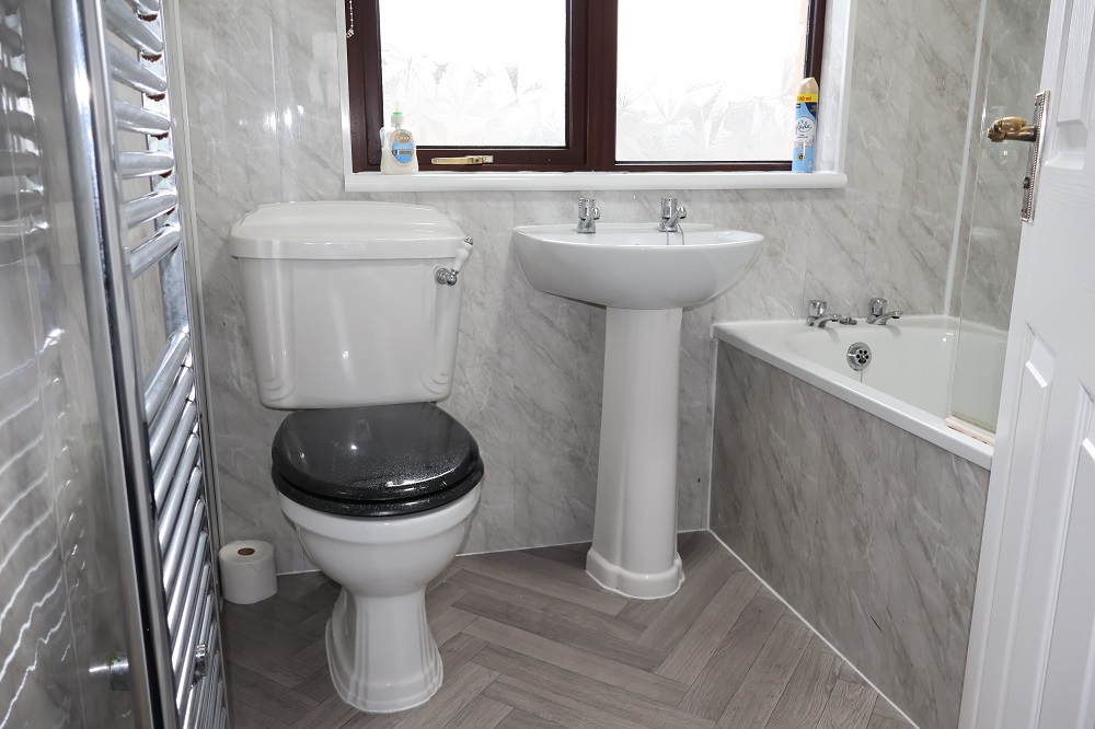 6'2 x 5'4 White 3 Piece suite comprising bath with shower screen and TRITON Electric shower over bath. Pedestal wash hand basin. Low flush w.c. Vinyl floor, wall and ceiling coverings. Chrome heated towel rail. LED recessed light to ceiling. Extractor fan.
