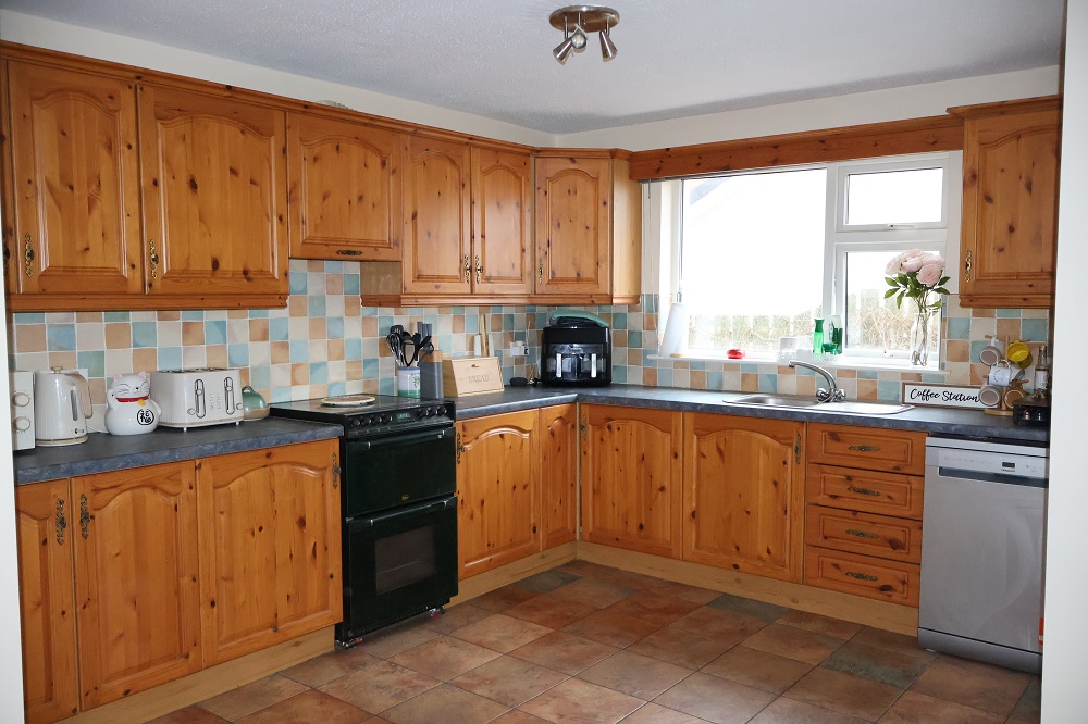 15'10 x 14'2 Excellent range of Antique Pine units with matching worktops. Stainless steel sink unit and single drainer with chrome mixer taps. Part tiled walls. Tiled floor to kitchen area. Oak floor to dining area. Window pelmet. Plumbed for dishwasher. BELLING cooker with concealed extractor fan.
