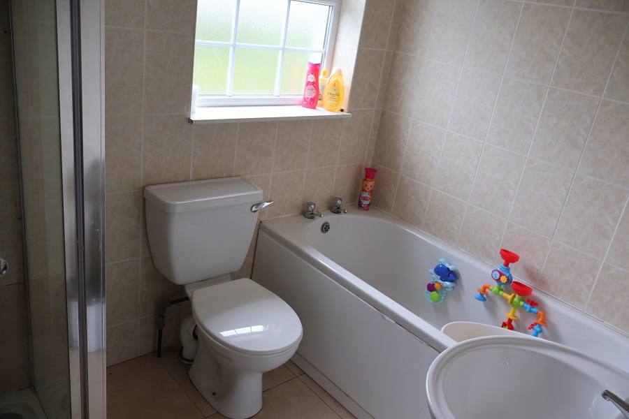 7'8 x 5'6 White 4 Piece suite comprising bath. Pedestal wash hand basin. Low flush w.c. and Separate shower unit with TRITON Electric shower. Tiled walls and floor.