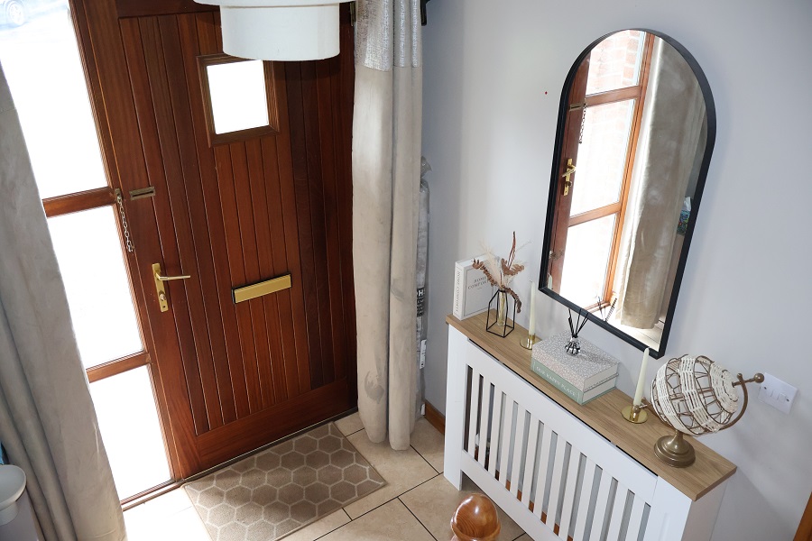 Hardwood front door with double centre light and side screen. Tiled floor. Feature radiator cover. Ornate redwood staircase.