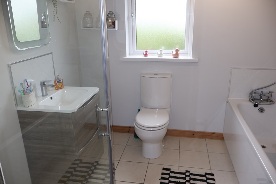 White 3 Piece suite comprising walk-in shower unit with power shower. Vanity unit with wash hand basin. Low flush w.c. Half tiled walls. Tiled floor. Chrome heated towel rail.