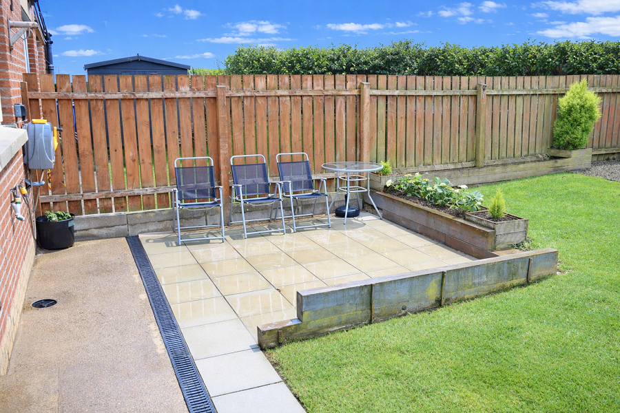 Good site with front garden laid out in lawns and shrubs. Tarmac driveway to side of dwelling leading to garage space at rear. South facing rear garden with paved area enclosed by timber fence and gates. Outside lights and water tap.