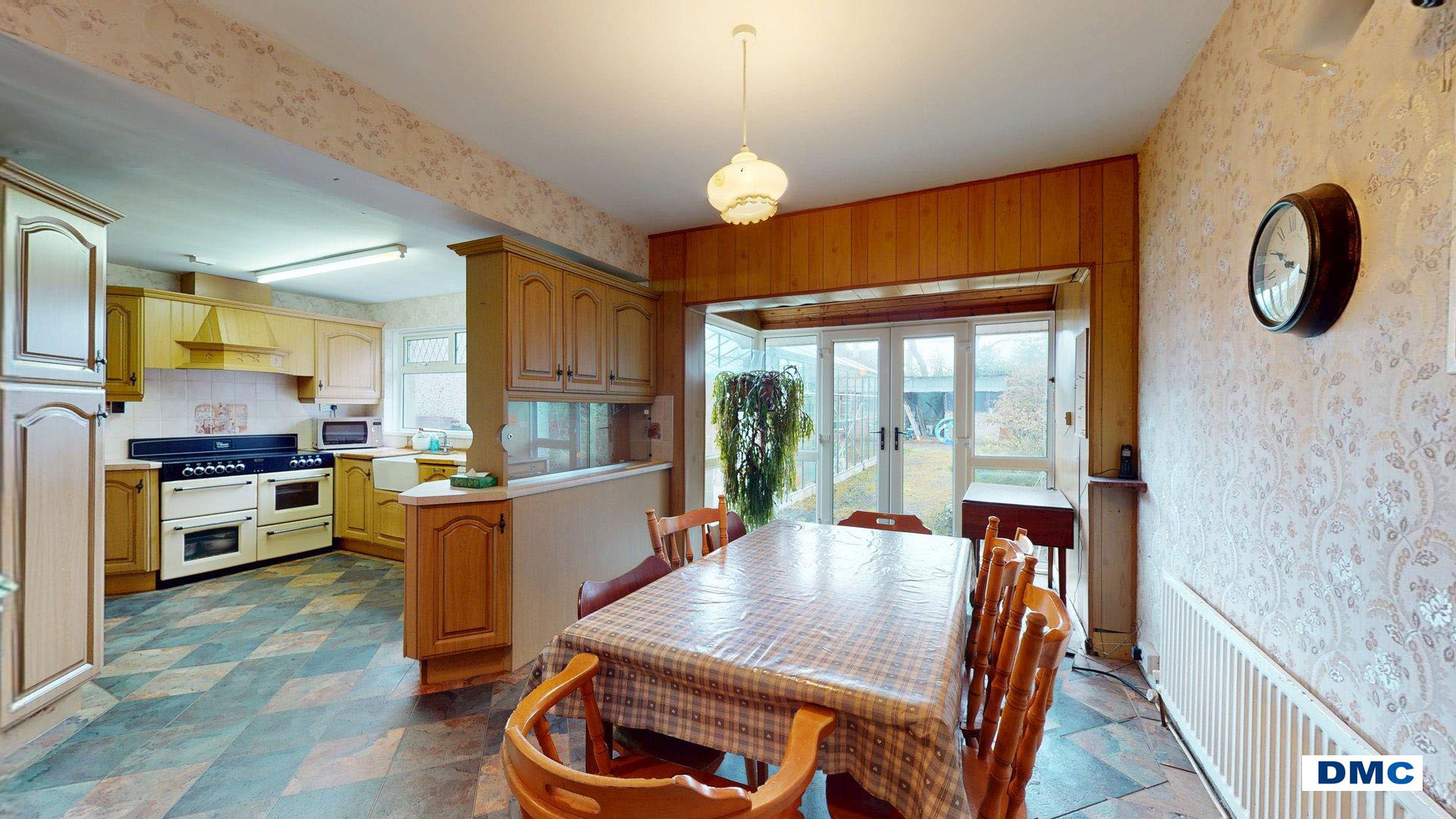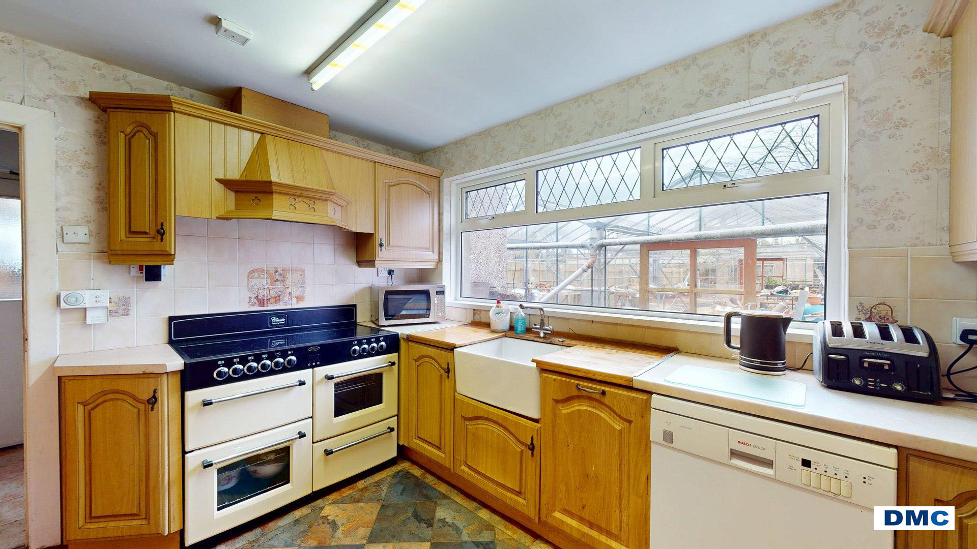 21'6 x 14'0 Good range of Light Oak units with matching worktops. BELFAST sink unit with chrome mixer taps. Part tiled walls. Vinyl floor covering. Plumbed for dishwasher. Larder unit. Belling Classic range cooker. uPVC French Doors leading out into large south facing garden.