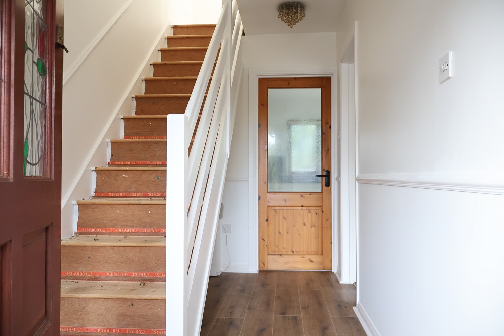 Hardwood front door with stained glass centre light and side screen. Walnut flooring.