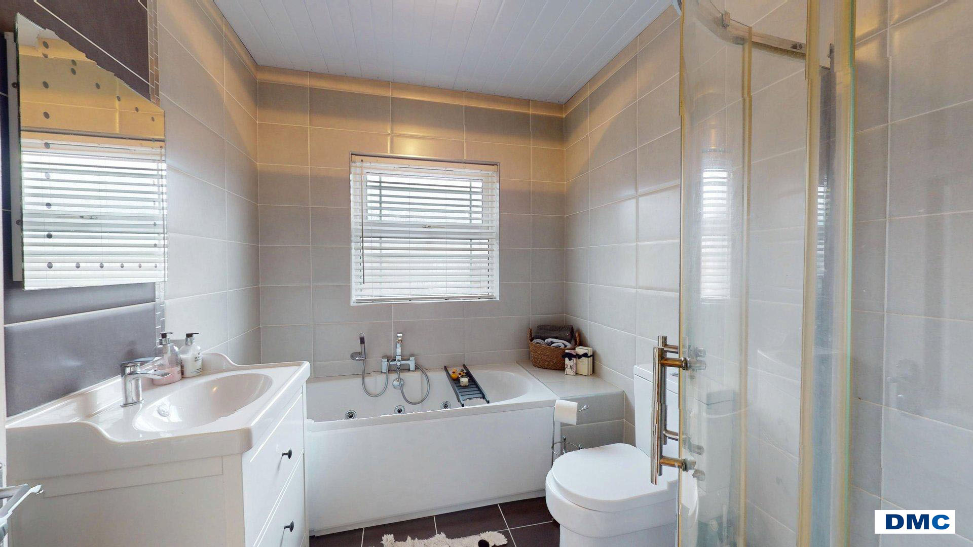 8'2 x 6'8 Deluxe white 4 piece suite comprising jacuzzi bath with mixer taps and shower attachment. Vanity unit with wash hand basin. Low flush w.c. Separate corner shower unit with overhead rain shower. Modern tiling to walls and floor. Vinyl ceiling covering. Wall mirror.
