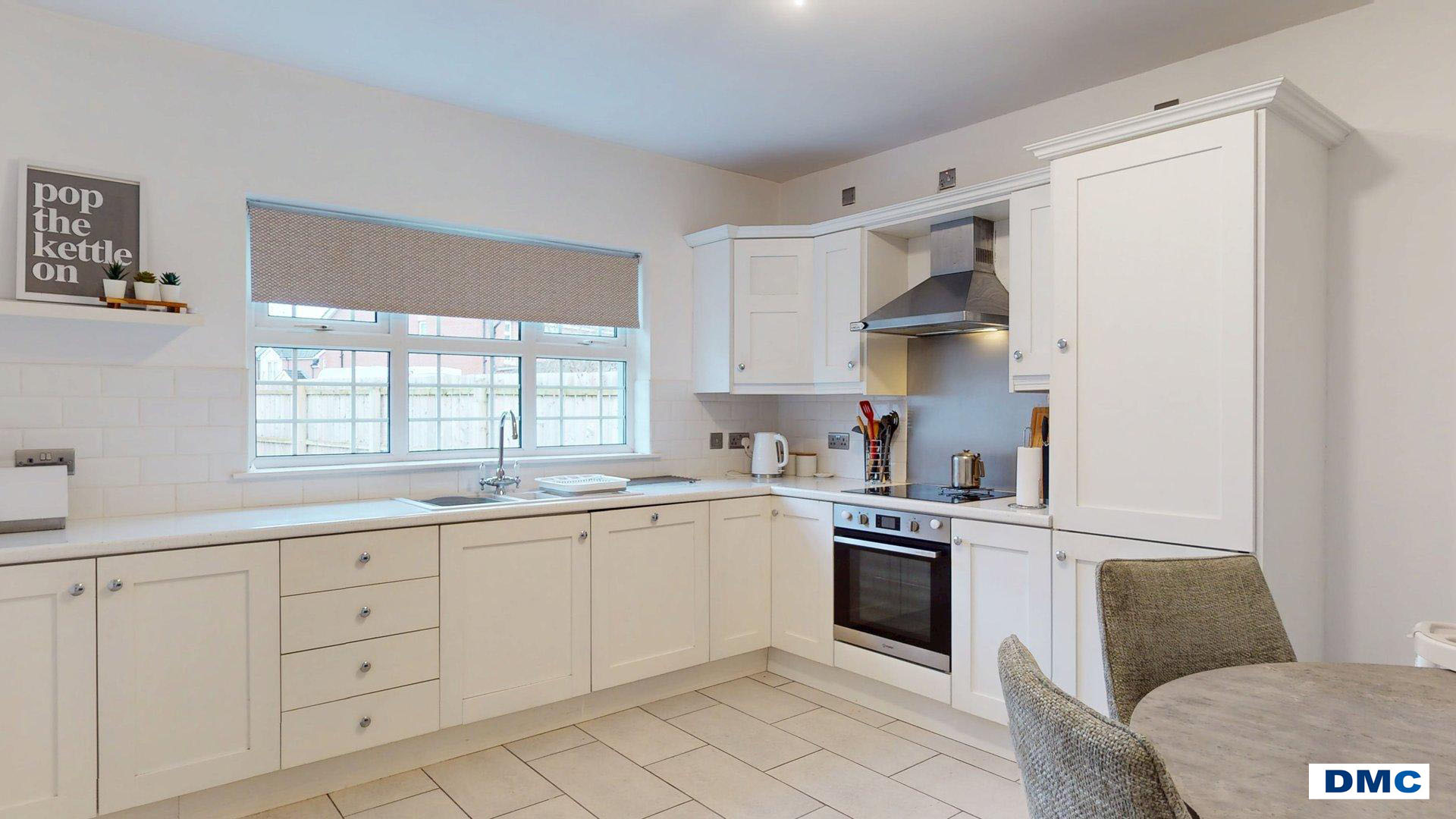 13'8 x 11'8 Excellent range of Contemporary Shaker style units with matching worktops. Ceramic one and a quarter bowl sink unit and drainer with chrome mixer taps. Modern tiling to walls and floors. BEKO integral dishwasher. Integral dishwasher. Integral fridge/freezer. INDESIT underoven and CANDY 4 ring Induction hob with stainless steel canopy housing concealed extractor fan.