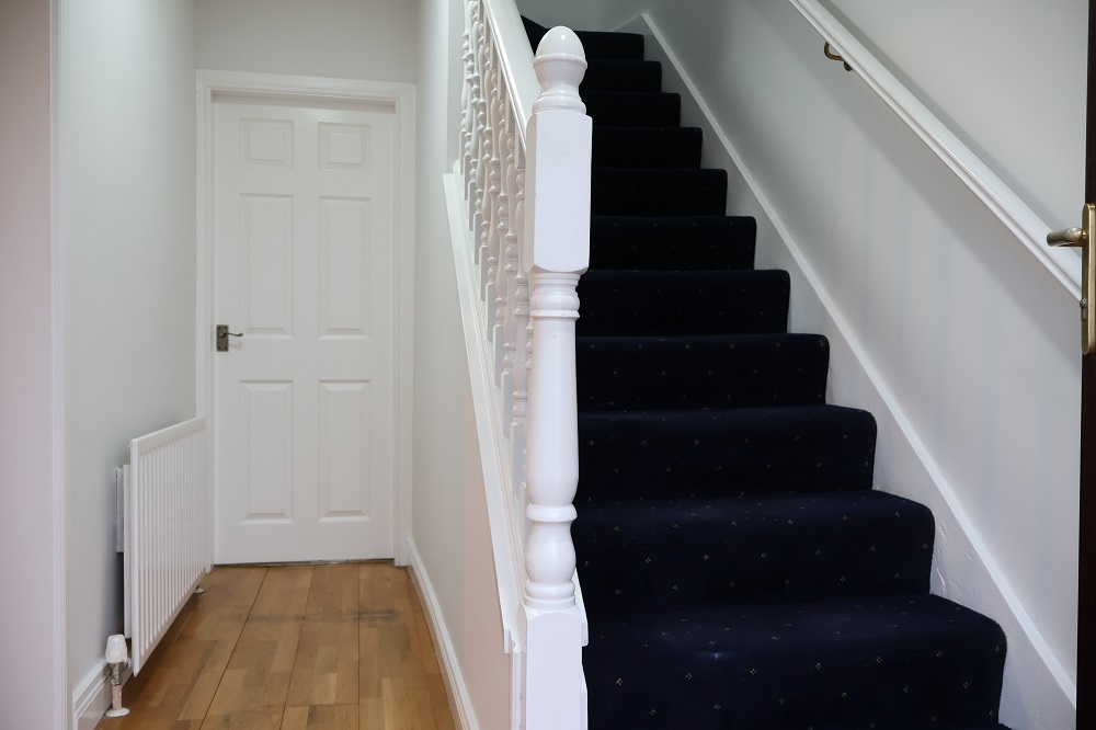 uPVC front door with double glazed centre light and side screen. Solid Oak floor. Feature staircase. LED recessed light to ceiling.