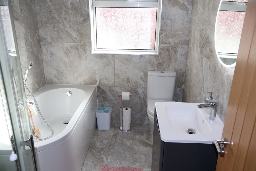 8'2 x 6'4 White, modern 4 piece suite comprising bath with central mixer taps and shower attachment. Feature Vanity unit with wash hand basin. Low flush w.c. Separate corner shower with MIRA Sport Electric shower. Anthracite heated towel rail. LED wall mirror. Feature tiling to walls and floor.