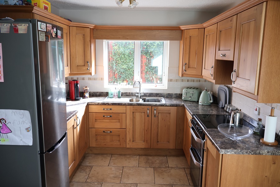 14'10 x 9'10 Excellent range of Natural Oak shker style units with matching worktops and splashbacks. Stainless steel one and quarter bowl sink unit and drainer with chrome mixer taps. Part tiled walls. Tiled floor. Window pelmet. Display lights to wall units. BELLING free standing cooker with concealed extractor fan.