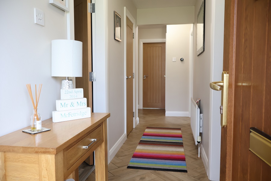 uPVC composite front door with double glazed centre light. Oak herringbone floor. Shelved Hotpress with new hot water tank and willis type immersion heater. Cloakroom.